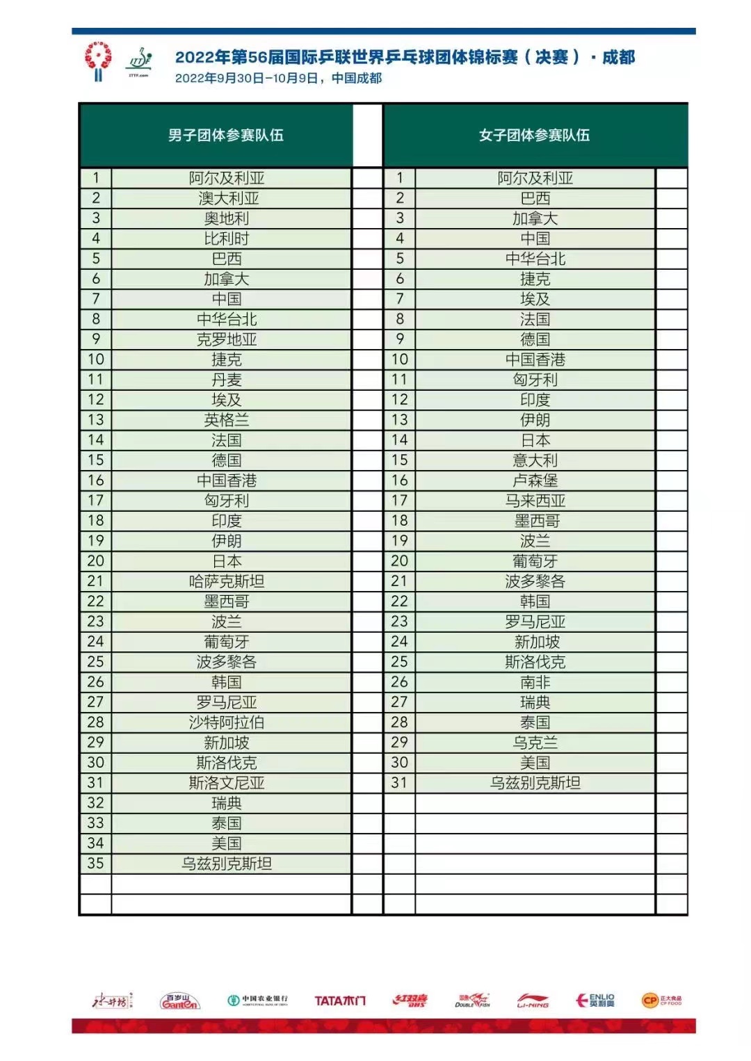 成都世乒赛团体赛参赛名单公布 抽签仪式定于