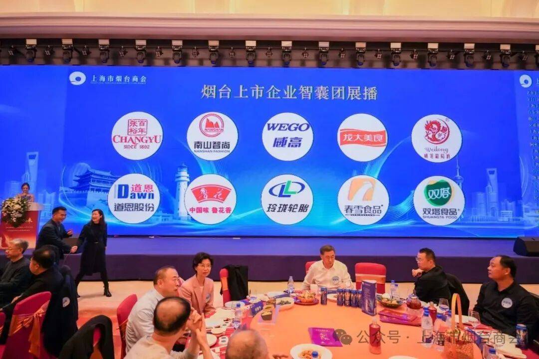 开场前首先展播了烟台上市企业智囊团风采。据烟台财政局统计,截至2025年11月,烟台境内上市公司51家、港股7家,总市值约1.29万亿元(境内),居山东省首位。上市企业是区域经济高质量发展的核心引擎,也是所有中小型企业的标杆和灯塔。多数上市企业在上海设立有研发中心、办事处或子公司等分支机构。为了更好地连接资源□-、产业联动,我们邀请了有代表性的上市公司组成★•“上市企业智囊团”,张裕、南山智尚、威高、玲珑轮胎、鲁花等知名企业集体亮相,彰显烟台产业实力与品牌魅力。